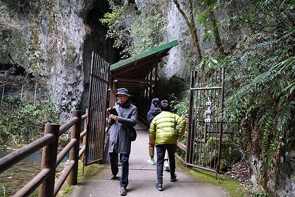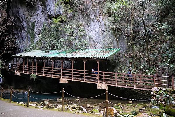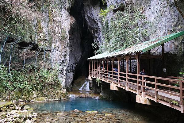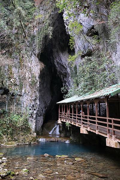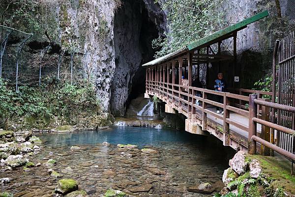 來到洞口,只見一條湍急的地下河從洞穴中流出,一道木橋延伸入內,可說是渾然天成。