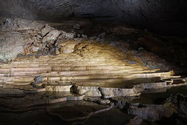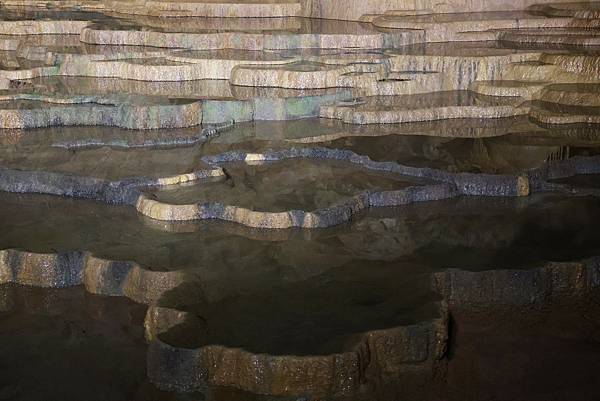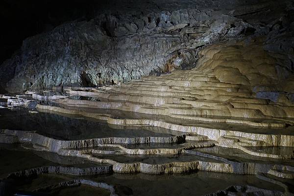雨水及溪水交互溶解石灰礦物質,接著堆積成一層一層、一圈又一圈的小水池,眼前的場景像是一層層梯田,在燈光的襯托下,真的很美。