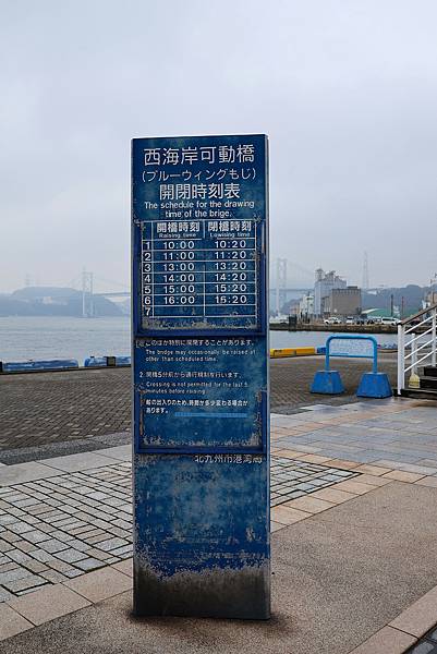 藍翼門司吊橋是日本少數的開關式吊橋,雖然現在沒什麼船隻進出門司港但為了吸引觀光客,會定期開橋讓船隻通過,也是日本唯一的步行者專用開關式吊橋,一天會開閉橋六次,約 24m長的母橋和約 14.4m的子橋會往上升至水面成60度的角度,拉上去約需要4分鍾,放下來約需要8分鍾,是許多人來門司港這裡必看的開橋秀。